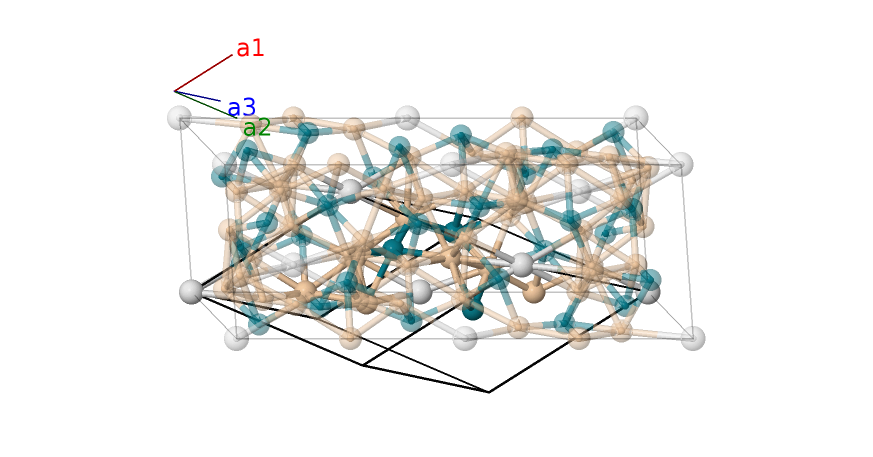| $\mathbf{B_{21}}$ | = | $\left(y_{4} + \frac{1}{2}\right) \, \mathbf{a}_{1}+\left(x_{4} + \frac{1}{2}\right) \, \mathbf{a}_{2}+\left(z_{4} + \frac{1}{2}\right) \, \mathbf{a}_{3}$ | = | $\frac{1}{2}a \left(y_{4} - z_{4}\right) \,\mathbf{\hat{x}}+\frac{\sqrt{3}}{6}a \left(2 x_{4} - y_{4} - z_{4}\right) \,\mathbf{\hat{y}}+\frac{1}{6}c \left(2 x_{4} + 2 y_{4} + 2 z_{4} + 3\right) \,\mathbf{\hat{z}}$ | (12f) | Si II |