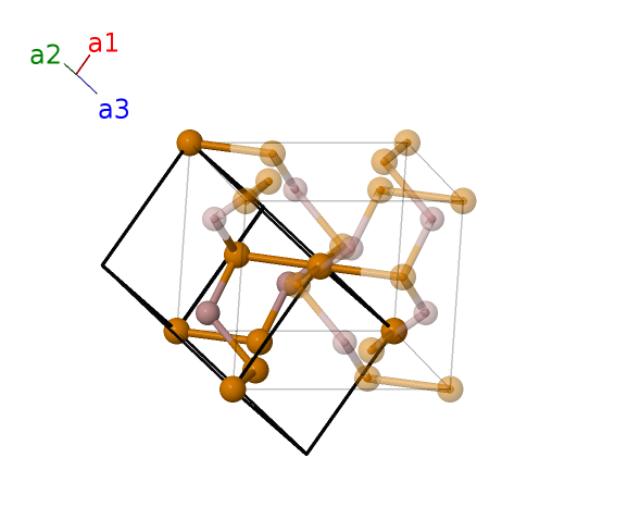 $\mathbf{B_{2}}$ | = | $\frac{3}{4} \, \mathbf{a}_{1}+\frac{1}{4} \, \mathbf{a}_{2}+\frac{1}{2} \, \mathbf{a}_{3}$ | = | $\frac{1}{2}a \,\mathbf{\hat{y}}+\frac{1}{4}c \,\mathbf{\hat{z}}$ | (4d) | Ga I |