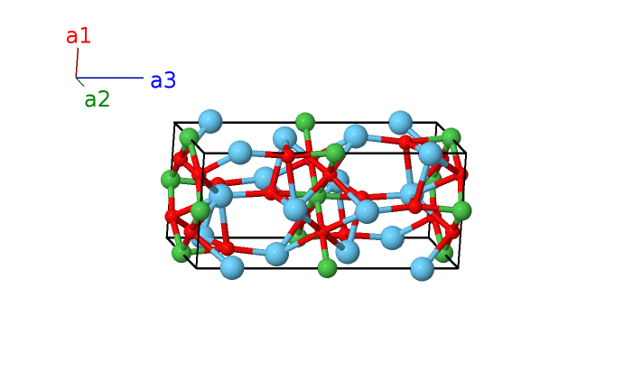 $\mathbf{B_{4}}$ | = | $\frac{3}{4} \, \mathbf{a}_{1}+\frac{1}{4} \, \mathbf{a}_{2}+\frac{1}{2} \, \mathbf{a}_{3}$ | = | $\frac{3}{4}a \,\mathbf{\hat{x}}+\frac{1}{4}a \,\mathbf{\hat{y}}+\frac{1}{2}c \,\mathbf{\hat{z}}$ | (4a) | O I |