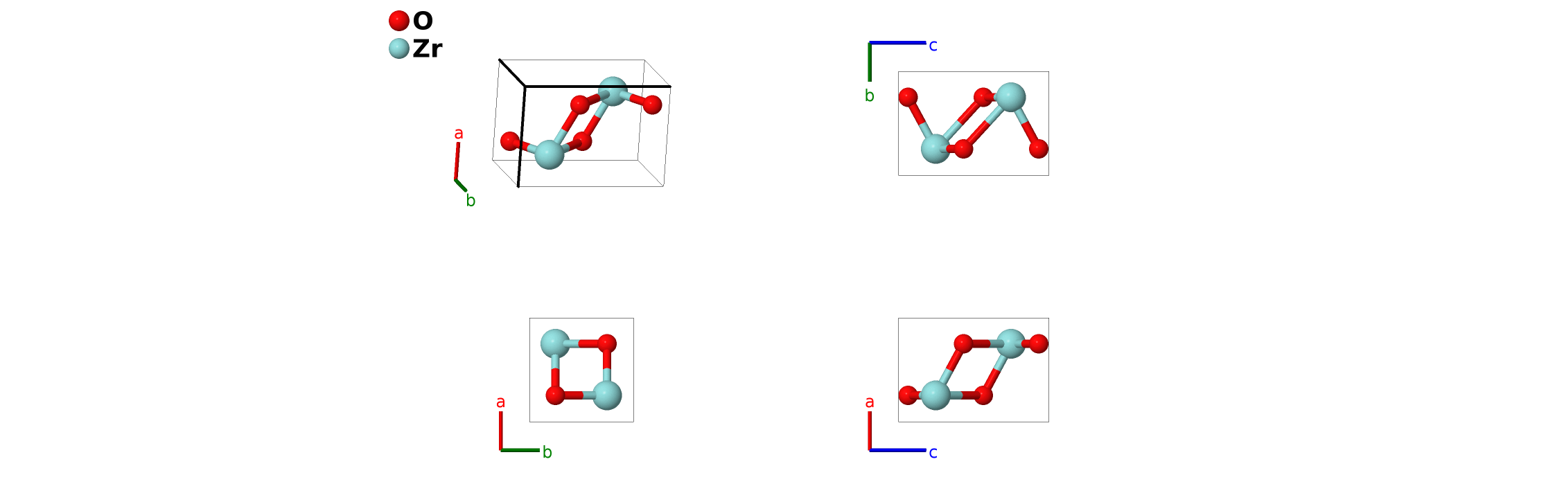 $\mathbf{B_{2}}$ | = | $\frac{1}{4} \, \mathbf{a}_{1}+\frac{3}{4} \, \mathbf{a}_{2}+\frac{1}{4} \, \mathbf{a}_{3}$ | = | $\frac{1}{4}a \,\mathbf{\hat{x}}+\frac{3}{4}a \,\mathbf{\hat{y}}+\frac{1}{4}c \,\mathbf{\hat{z}}$ | (2a) | Zr I |