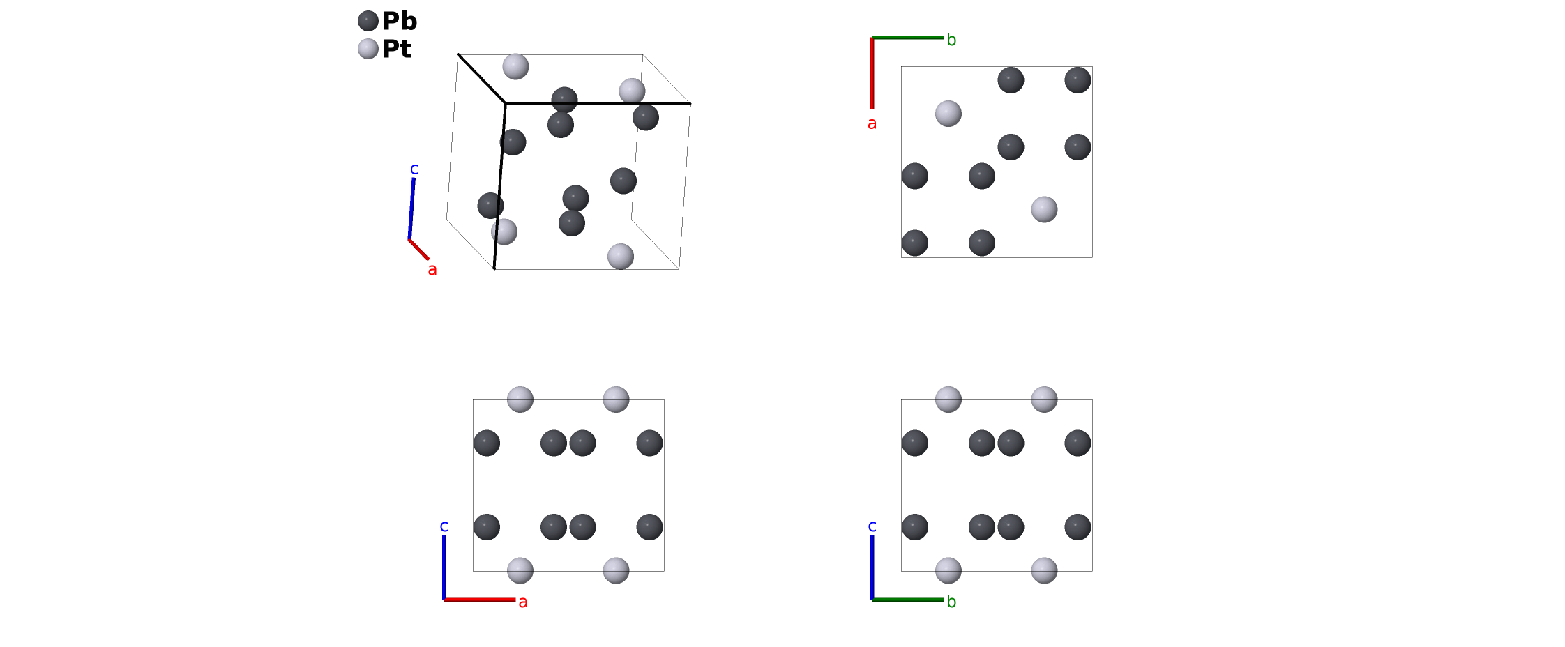 $\mathbf{B_{5}}$ | = | $\left(x_{2} + \frac{1}{2}\right) \, \mathbf{a}_{1}+x_{2} \, \mathbf{a}_{2}+z_{2} \, \mathbf{a}_{3}$ | = | $a \left(x_{2} + \frac{1}{2}\right) \,\mathbf{\hat{x}}+a x_{2} \,\mathbf{\hat{y}}+c z_{2} \,\mathbf{\hat{z}}$ | (8m) | Pb I |