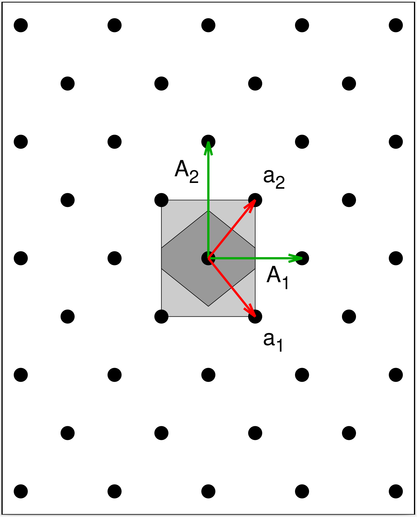 Wigner-Seitz cell shaded in dark gray. The green